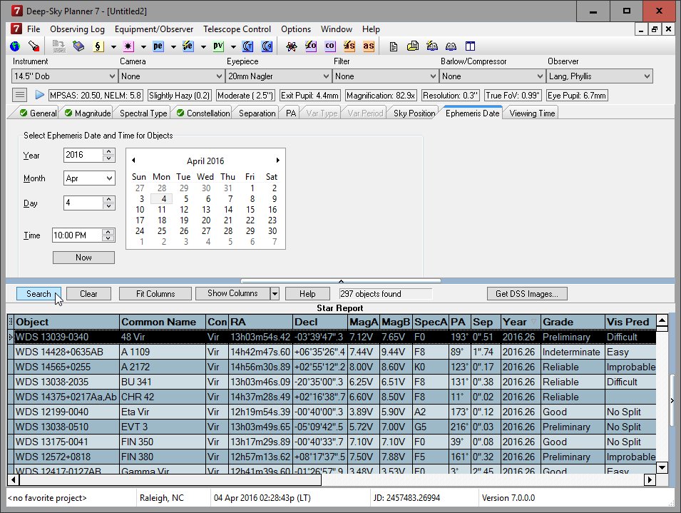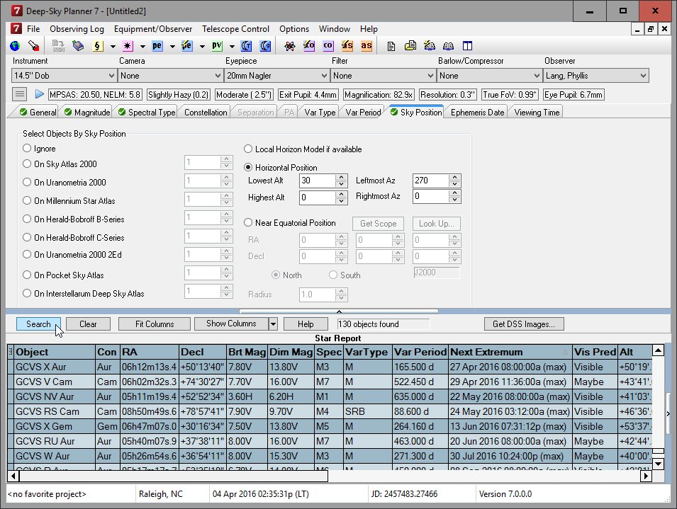 Deep-Sky Planner 9 allows you to search through a database of over 700,000 stars from 7 catalogs - carbon stars, double stars, variable stars and ordinary stars - and report results in a tabular format. In addition to essential object data, the contents of a report can be configured to include or exclude any item (column) of data. Deep-Sky Planner also computes high precision ephemerides for well-studied visual double stars, as well as the date & time of next light extrema for well-studied variable stars.